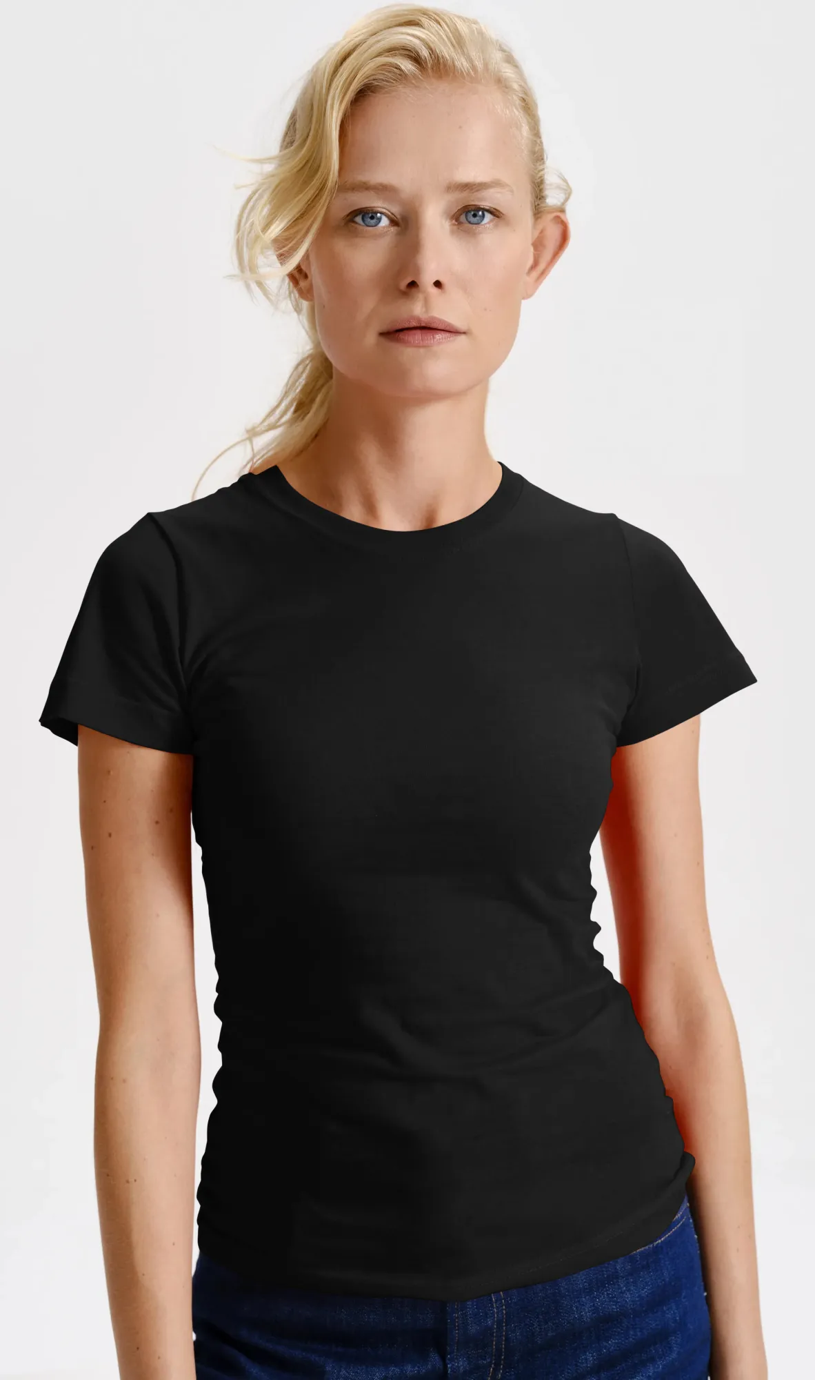 Klasyczny damski T-shirt ma klasyczny okrągły dekolt i odpowiedni rozmiar. Nie jest za ciasny, ani niepotrzebnie duży.